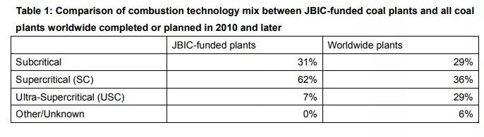 表1是JBIC资助的燃煤电厂与全球所有燃煤电厂之间燃烧技术组合的比较,JBIC资助的燃煤电厂的效率低于全球平均水平。