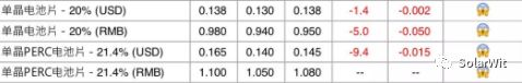 本周国内多晶电池价格跌价2分,跌幅-2.1%;而海外多晶电池跌价0.005美分,跌幅-4.2%,价格来到了0.115美分,折合人民币0.9元,海外多晶电池价格已经低于国内电池价格了。